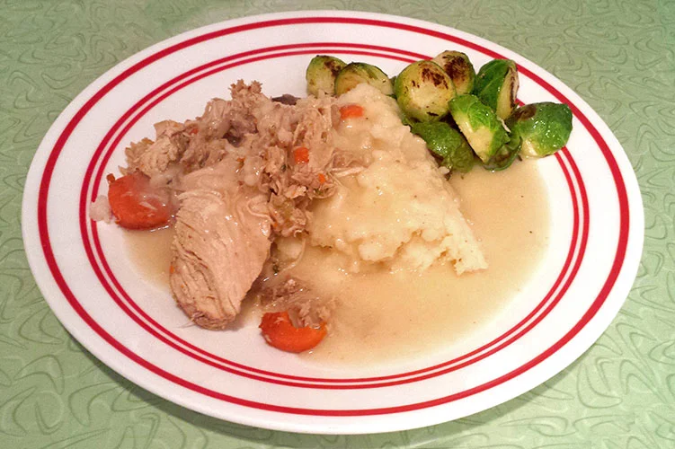 This recipe made a ton of food, at least 6 full meals. The chicken itself cost less than $4, so cost for each meal was minimal. For the first meal we poured it over egg noodles. For the second meal, I made mashed potatoes and brussel sprouts and served the fricassee with that. The rest of the chicken and gravy I froze to make soup at a later date.