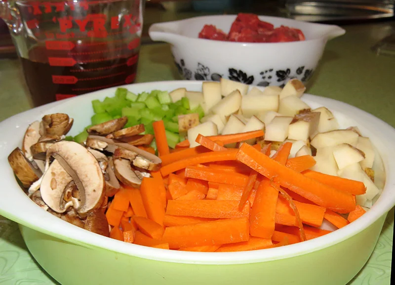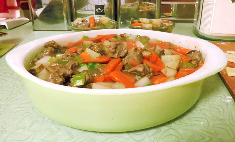 The recipe suggests that I use Pyrex's Lime Green Baking Dish and since it was a dish I owned, I decided to do just that. The first step was to chop and prepare the vegetables and meat. Their recipe said that you could use canned meat, but I decided that it would be gross, so opted to brown some cubes of beef instead. The recipe called for onion, celery, carrots and potatoes. I added some mushrooms and frozen peas as well.