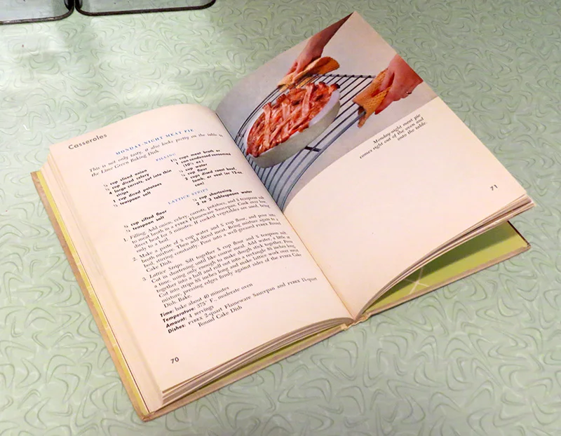 So far, most of the recipes I've tried have been sweet so I decided to make something savory for this week's cookbook challenge. I chose "Monday-Night Meat Pie", from the cookbook "Pyrex Prize Recipes" published in 1953. I picked up this little book at Goodwill a few months ago as a perfect addition to my substantial Pyrex collection. I like to use as many of my dishes as possible, so this was the perfect opportunity to do that.