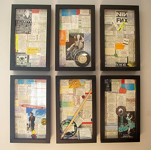 Our ticket wall displaying tickets and memorabilia from concerts we've attended.