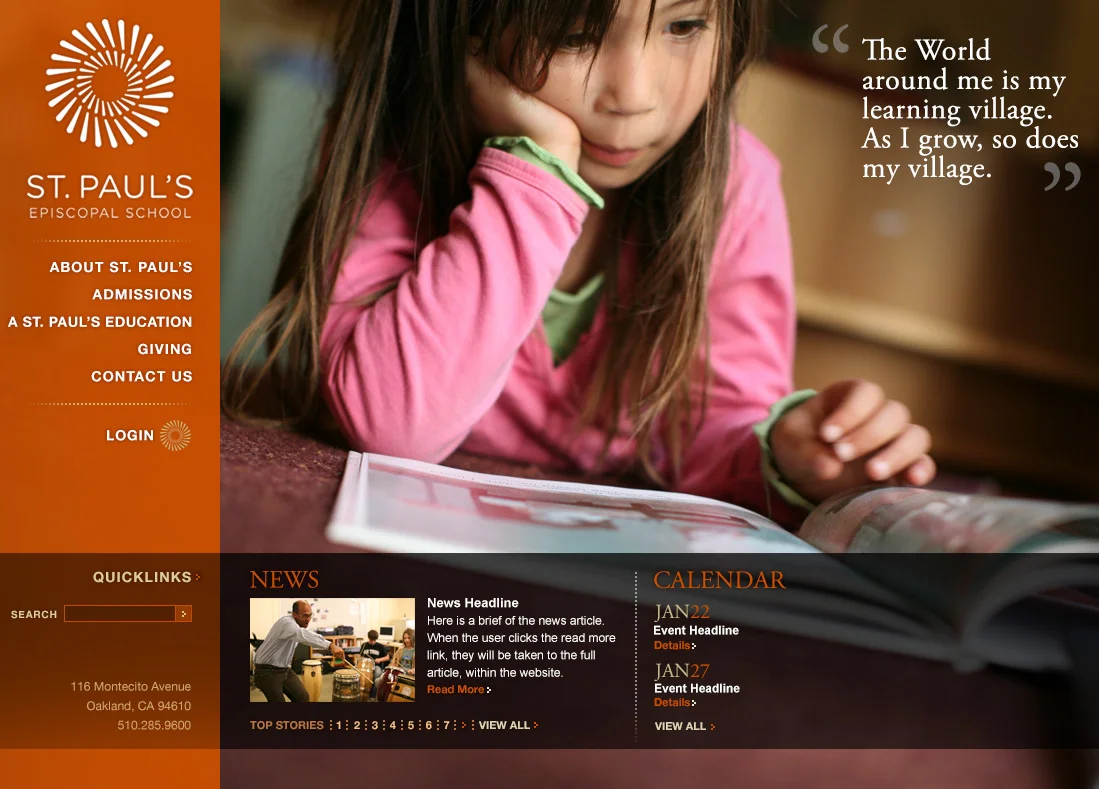 This homepage features a large rotating photo and accompanying quotes. As a break from the usual horizontal navigation, the site navigation is placed vertically down the left side of the page. An area for news and calendar is positioned horizontally across the bottom of the page. If no news or events are present, this horizontal bar goes away automatically until needed. On the interior template of the site, the main level navigation is positioned horizontally accross the top of the page to make room for any lower-level navigation that is needed. As this site was built on an older CMS, it is non-responsive, but the client has the ability to edit content and layout on all pages.